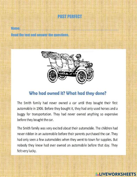 Past Perfect Reading. Present, past tense, past perfect, present perfect, future. 11 past perfect questions 12 questions exercises.